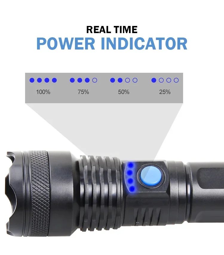 *Charging Indicator: The flashlight has 4 indicator lights to determine the remaining power at any time.
